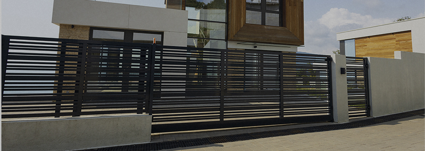 На фото: откатные ворота и калитка с заполнением из алюминиевых профилей шириной 82 мм.
